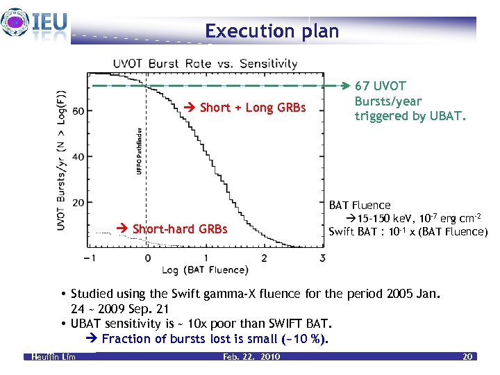 Execution plan Short + Long GRBs Short-hard GRBs 67 UVOT Bursts/year triggered by UBAT. BAT Fluence 15 -150 ke. V, 10 -7 erg cm-2 Swift BAT : 10 -1 x (BAT Fluence) • Studied using the Swift gamma-X fluence for the period 2005 Jan. 24 ~ 2009 Sep. 21 • UBAT sensitivity is ~ 10 x poor than SWIFT BAT. Fraction of bursts lost is small (~10 %). Heuijin Lim Feb. 22. 2010 20
