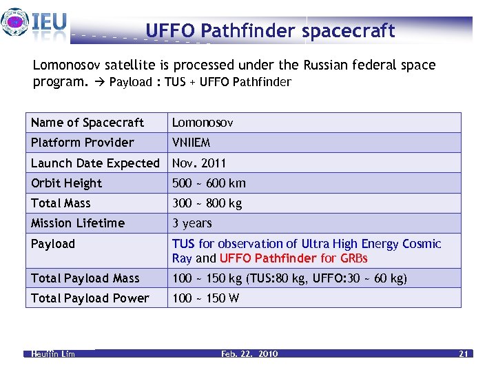 Lomonosov Satellite Space viewing UFFO here Earth viewing TUS telescope Heuijin Lim Feb. 22. 2010 22