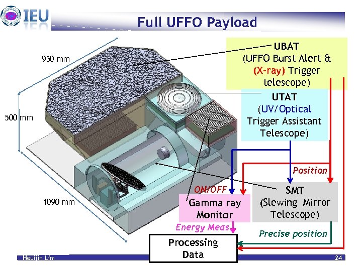 Full UFFO Payload UBAT (UFFO Burst Alert & (X-ray) Trigger telescope) UTAT (UV/Optical Trigger Assistant Telescope) 950 mm 500 mm Position ON/OFF 1090 mm Gamma ray Monitor Energy Meas. Heuijin Lim Processing Data Feb. 22. 2010 SMT (Slewing Mirror Telescope) Precise position 24
