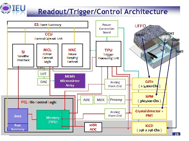 Readout/Trigger/Control Architecture ES Event Summary Power Generation Board CCU Central Control Unit SI Satellite Interface MCL Mirror Control Logic UFFO UBAT UTAT GRM HKC TPU House Keeping Control SMT Trigger Processing Unit 8 bit LUT DAC FCL Fifo Control Logic data Run Summary Heuijin Lim Memory (FIFO) MEMS Micromirror Array Analog Front-End ADC MUX Cd. Te ( > 5, 000 Chs ) Preamp Si. PM ( 360, 000 Chs ) Analog Front-End 10 bit ADC Feb. 22. 2010 Crystal detector + PMT ICCD ( 256 x 256 Chs ) 26