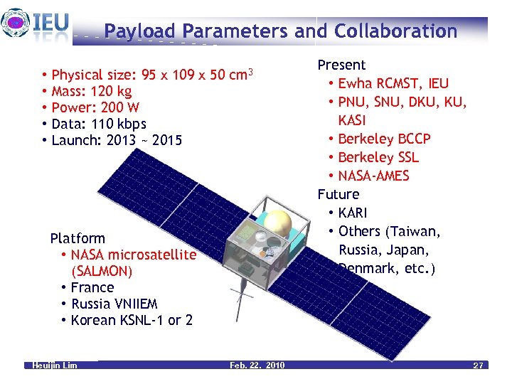Payload Parameters and Collaboration • • • Physical size: 95 x 109 x 50 Mass: 120 kg Power: 200 W Data: 110 kbps Launch: 2013 ~ 2015 cm 3 Platform • NASA microsatellite (SALMON) • France • Russia VNIIEM • Korean KSNL-1 or 2 Heuijin Lim Feb. 22. 2010 Present • Ewha RCMST, IEU • PNU, SNU, DKU, KASI • Berkeley BCCP • Berkeley SSL • NASA-AMES Future • KARI • Others (Taiwan, Russia, Japan, Denmark, etc. ) 27