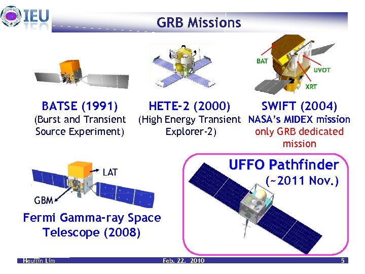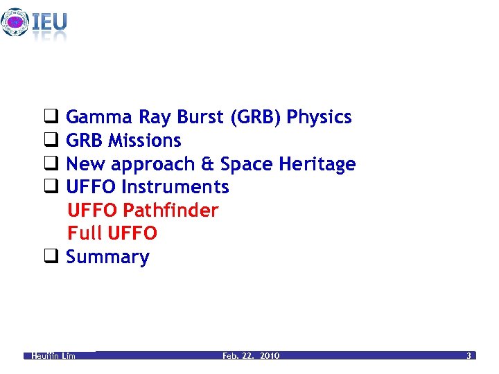 q Gamma Ray Burst (GRB) Physics q GRB Missions q New approach & Space Heritage q UFFO Instruments UFFO Pathfinder Full UFFO q Summary Heuijin Lim Feb. 22. 2010 3