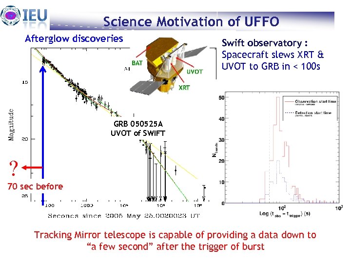 Science Motivation of UFFO Afterglow discoveries Swift observatory : Spacecraft slews XRT & UVOT to GRB in < 100 s GRB 050525 A UVOT of SWIFT ? 70 sec before Tracking Mirror telescope is capable of providing a data down to “a few second” Feb. 22. the trigger of burst after 2010 Heuijin Lim 6