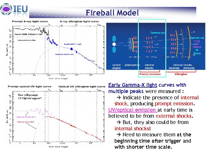 Fireball Model Heuijin Lim Feb. 22. Early Gamma-X light curves with multiple peaks were measured : Indicate the presence of internal shock, producing prompt emission. UV/optical emission at early time is believed to be from external shocks. But, they also could be from internal shocks! Need to measure them at the beginning time after trigger and 2010 7 with shorter time scale.
