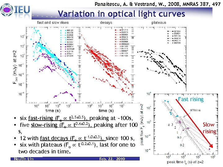 Panaitescu, A. & Vestrand, W. , 2008, MNRAS 387, 497 Variation in optical light curves Fast rising • six fast-rising (Fo t 2. 5± 0. 5), peaking at ~100 s, • five slow-rising (Fo t 0. 6± 0. 2), peaking after 100 s, • 12 with fast decays (Fo t-1. 0± 0. 3), since 100 s, • six with plateaus (Fo t-0. 2± 0. 1), last for one to two decades in time. Heuijin Lim Feb. 22. 2010 Slow rising 8