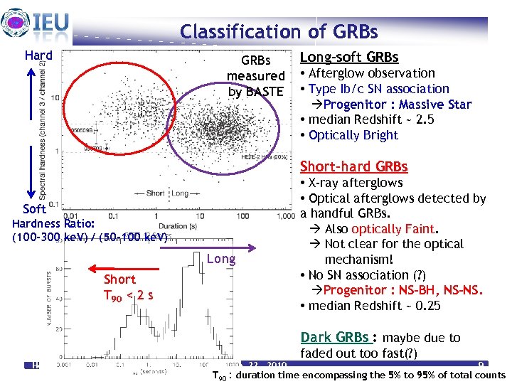 Classification of GRBs Hard GRBs measured by BASTE Long-soft GRBs • Afterglow observation • Type Ib/c SN association Progenitor : Massive Star • median Redshift ~ 2. 5 • Optically Bright Short-hard GRBs Soft Hardness Ratio: (100 -300 ke. V) / (50 -100 ke. V) Long Short T 90 < 2 s • X-ray afterglows • Optical afterglows detected by a handful GRBs. Also optically Faint. Not clear for the optical mechanism! • No SN association (? ) Progenitor : NS-BH, NS-NS. • median Redshift ~ 0. 25 Dark GRBs : maybe due to Heuijin Lim Feb. 22. 2010 faded out too fast(? ) 9 T 90 : duration time encompassing the 5% to 95% of total counts