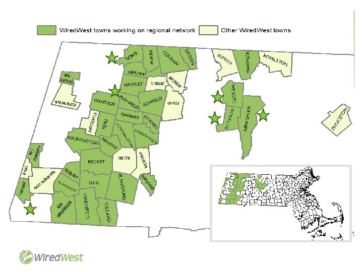 Mass. Broadband Institute (MBI) The Massachusetts Broadband Institute was formed in 2008 by the Patrick administration with the mission to “connect the unconnected” Built the “middle mile” to CAI’s (Community Anchor Institutions): Schools, Town Halls, Libraries, Fire Stations, Police Stations, etc. Is now partnering with Wired. West to build a regional fiber network to connect the “last mile”