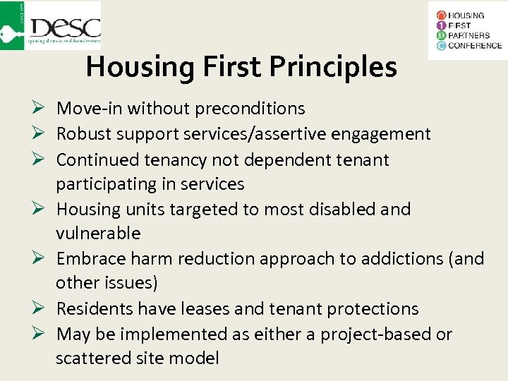 Housing First Principles Move-in without preconditions Robust support services/assertive engagement Continued tenancy not dependent tenant participating in services Housing units targeted to most disabled and vulnerable Embrace harm reduction approach to addictions (and other issues) Residents have leases and tenant protections May be implemented as either a project-based or scattered site model