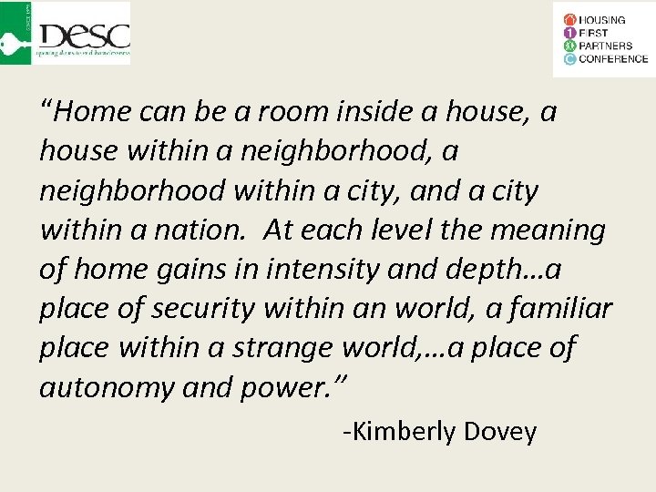 “Home can be a room inside a house, a house within a neighborhood, a neighborhood within a city, and a city within a nation. At each level the meaning of home gains in intensity and depth…a place of security within an world, a familiar place within a strange world, …a place of autonomy and power. ” -Kimberly Dovey