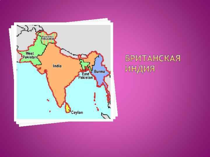 Британская Индия (англ. British Raj) — название британского колониального владения в Южной Азии с 1858 по 1947 годы. Постепенно расширявшаяся территория колонии со временем охватила территории современных Индии, Пакистана, Бангладеш и Мьянмы. Термином Британская Индия обычно называют всю территорию колониального владения, хотя, строго говоря, он относился только к тем частям субконтинента, которые находились под непосредственным британским управлением; помимо этих территорий существовали т. н. «туземные княжества» , формально находившиеся лишь в вассальной зависимости от Короны.