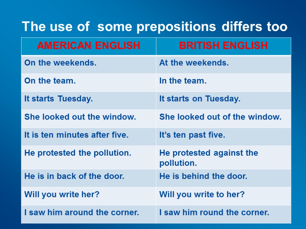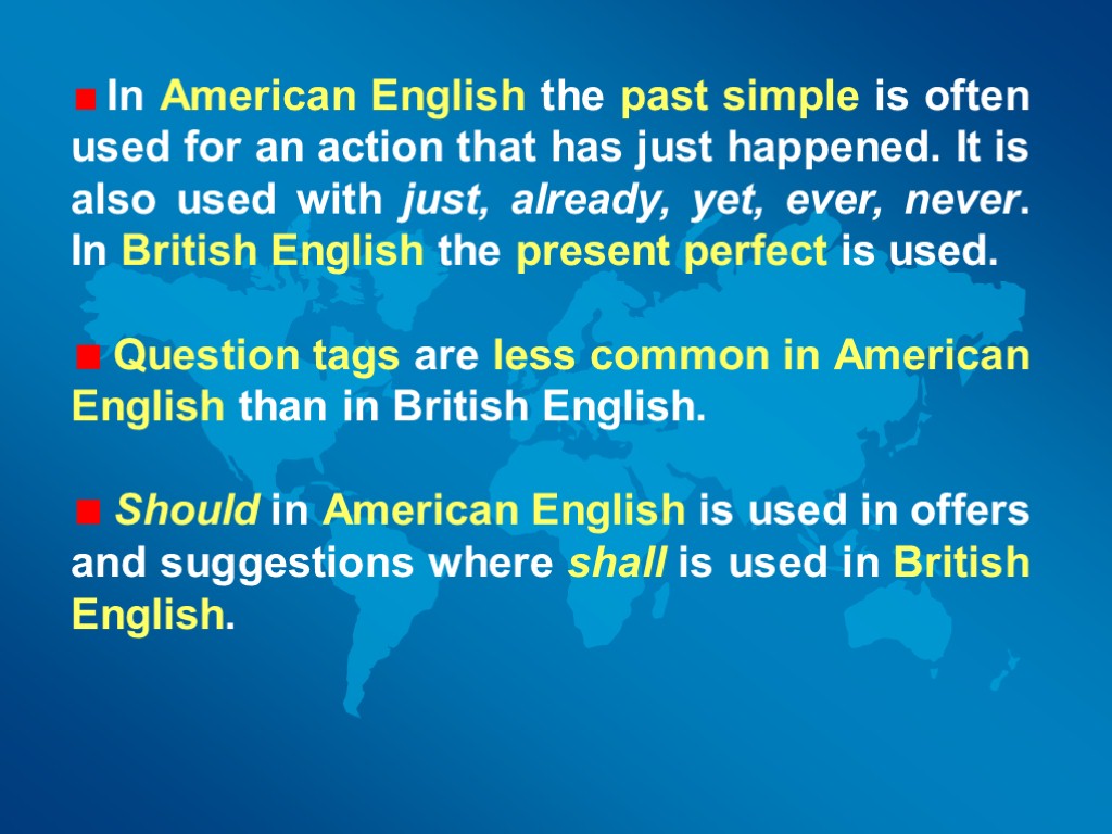 In American English the past simple is often used for an action that has just happened. It is also used with just, already, yet, ever, never. In British English the present perfect is used. Question tags are less common in American English than in British English. Should in American English is used in offers and suggestions where shall is used in British English.
