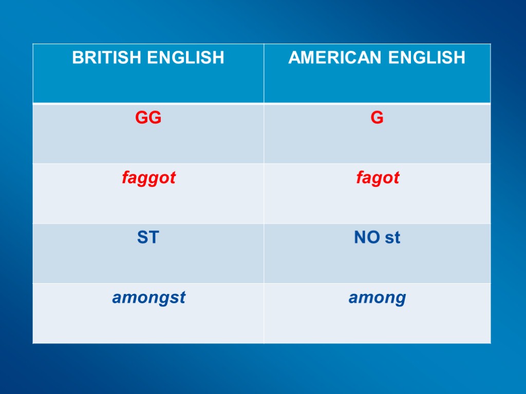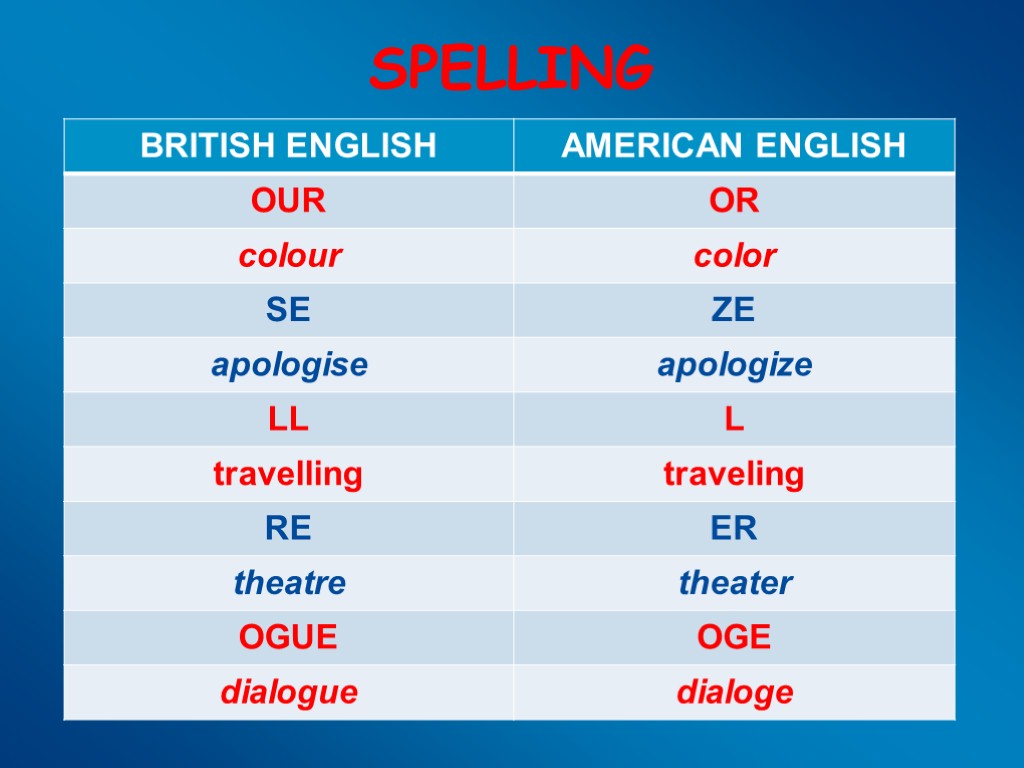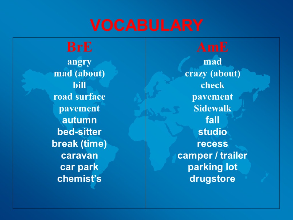 These two varieties of English differ in: Spelling Vocabulary Grammar Pronunciation