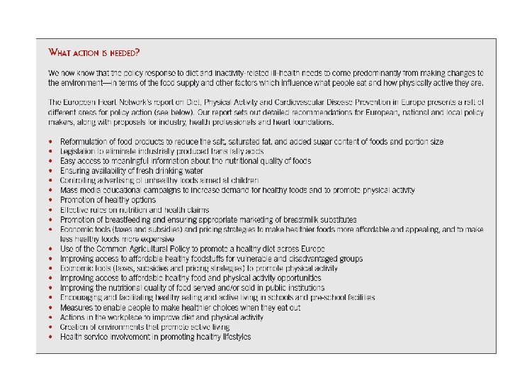 Prevention is key (p 14) • ‘CVD is largely preventable’ • ‘We know prevention works’ – Reducing CVD mortality in Ukrainian males to Japanese rates would be a reduction of 90% • ‘Even small changes to risk factor levels can dramatically reduce death and disability’ • ‘Prevention efforts have a much greater impact if directed at the whole population’ • ‘A preventive approach is cost-effective’ – Diet-related ill health in the UK costs the health system 7. 0 billion Euros – Physical activity – 1. 1. billion Euros
