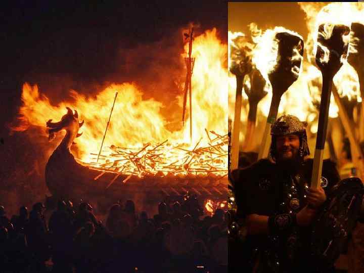 JANUARY Up-He. IIy-Aa The Shetlands are islands near Scotland. In the ninth centurv, men from Norway came to the Shetlands. These were the Vikings. They came to Britain in ships and carried away animals, gold, and sometimes women and children, too. Now, 1 , OOO years later, people in the Shetlands remember the Vikings with a festival. They call the festival "Up. Helly-Aa". Every winter the people of Lerwick, a town in the Shetlands, make a model of a ship. It's a Viking "long-ship", with the head of a dragon at the front. Then, on Up-Helly-Aa night in January, the Shetlanders dress in Viking clothes. They carry the ship through the town to the sea. There they burn it. They do this because the Vikings put their dead men in ships and burned them. But there aren't any men in the modern ships. Now the festival is a party for the people of the Shetland Islands.