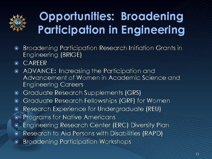 Opportunities: Broadening Participation in Engineering Broadening Participation Research Initiation Grants in Engineering (BRIGE) CAREER ADVANCE: Increasing the Participation and Advancement of Women in Academic Science and Engineering Careers Graduate Research Supplements (GRS) Graduate Research Fellowships (GRF) for Women Research Experience for Undergraduate (REU) Programs for Native Americans Engineering Research Center (ERC) Diversity Plan Research to Aid Persons with Disabilities (RAPD) Broadening Participation Workshops 11