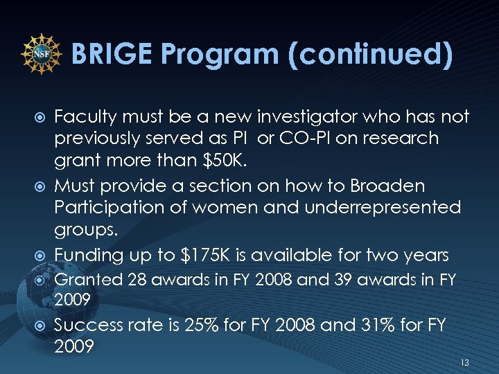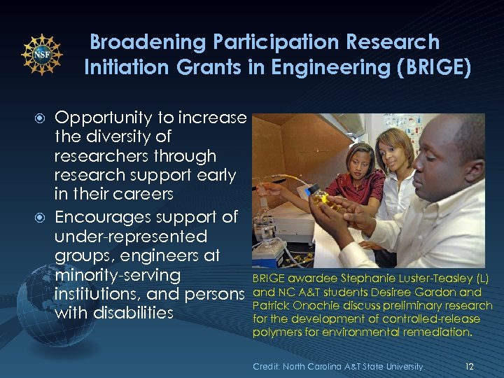 Broadening Participation Research Initiation Grants in Engineering (BRIGE) Opportunity to increase the diversity of researchers through research support early in their careers Encourages support of under-represented groups, engineers at minority-serving BRIGE awardee Stephanie Luster-Teasley (L) institutions, and persons and NC A&T students Desiree Gordon and Patrick Onochie discuss preliminary research with disabilities for the development of controlled-release polymers for environmental remediation. Credit: North Carolina A&T State University. 12