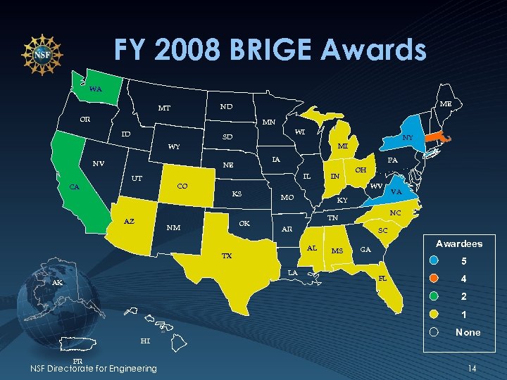 FY 2008 BRIGE Awards WA ME ND MT OR MN ID WI SD NY MI WY NV IA NE UT CA AZ PA IL CO KS OK NM OH WV MO VA KY NC TN AR SC AL TX MS Awardees GA 5 LA AK IN FL 4 2 1 HI PR NSF Directorate for Engineering None 14