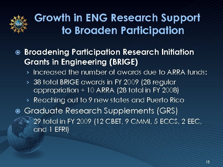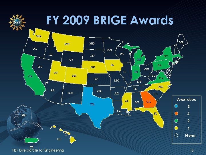 FY 2009 BRIGE Awards WA ME ND MT OR MN ID WI SD NY MI WY NV IA NE UT CA AZ PA IL CO KS OK NM OH WV MO VA KY NC TN AR SC AL TX MS Awardees GA 8 LA AK IN FL 4 2 1 HI PR NSF Directorate for Engineering None 16