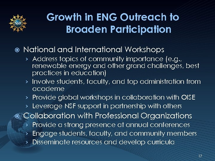 Growth in ENG Outreach to Broaden Participation National and International Workshops › Address topics of community importance (e. g. , renewable energy and other grand challenges, best practices in education) › Involve students, faculty, and top administration from academe › Provide global workshops in collaboration with OISE › Leverage NSF support in partnership with others Collaboration with Professional Organizations › Provide a strong presence at annual conferences › Engage students, faculty, and community members › Disseminate resources and develop curricula 17