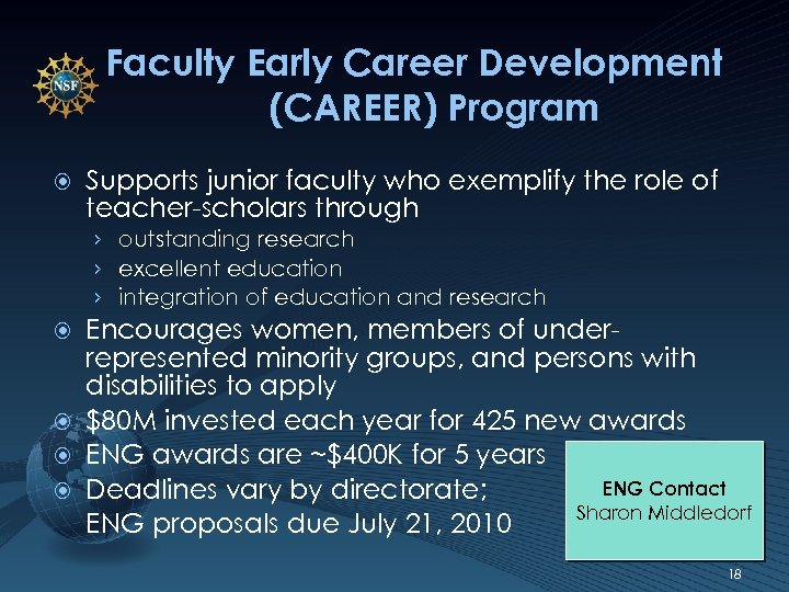 Faculty Early Career Development (CAREER) Program Supports junior faculty who exemplify the role of teacher-scholars through › outstanding research › excellent education › integration of education and research Encourages women, members of underrepresented minority groups, and persons with disabilities to apply $80 M invested each year for 425 new awards ENG awards are ~$400 K for 5 years ENG Contact Deadlines vary by directorate; Sharon Middledorf ENG proposals due July 21, 2010 18