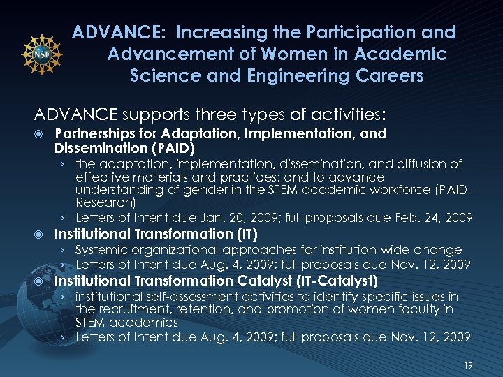 ADVANCE: Increasing the Participation and Advancement of Women in Academic Science and Engineering Careers ADVANCE supports three types of activities: Partnerships for Adaptation, Implementation, and Dissemination (PAID) › the adaptation, implementation, dissemination, and diffusion of effective materials and practices; and to advance understanding of gender in the STEM academic workforce (PAIDResearch) › Letters of Intent due Jan. 20, 2009; full proposals due Feb. 24, 2009 Institutional Transformation (IT) › Systemic organizational approaches for institution-wide change › Letters of Intent due Aug. 4, 2009; full proposals due Nov. 12, 2009 Institutional Transformation Catalyst (IT-Catalyst) › institutional self-assessment activities to identify specific issues in the recruitment, retention, and promotion of women faculty in STEM academics › Letters of Intent due Aug. 4, 2009; full proposals due Nov. 12, 2009 19