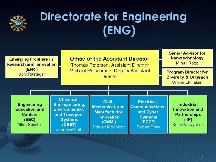 Directorate for Engineering (ENG) Emerging Frontiers in Research and Innovation (EFRI) Sohi Rastegar Engineering Education and Centers (EEC) Allen Soyster Office of the Assistant Director Thomas Peterson, Assistant Director Michael Reischman, Deputy Assistant Director Chemical, Bioengineering, Environmental, and Transport Systems (CBET) John Mc. Grath Civil, Mechanical, and Manufacturing Innovation (CMMI) Steven Mc. Knight Electrical, Communications, and Cyber Systems (ECCS) Robert Trew Senior Advisor for Nanotechnology Mihail Roco Program Director for Diversity & Outreach Omnia El-Hakim Industrial Innovation and Partnerships (IIP) Kesh Narayanan 2