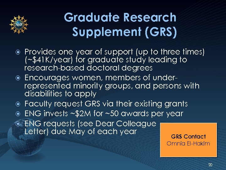 Graduate Research Supplement (GRS) Provides one year of support (up to three times) (~$41 K/year) for graduate study leading to research-based doctoral degrees Encourages women, members of underrepresented minority groups, and persons with disabilities to apply Faculty request GRS via their existing grants ENG invests ~$2 M for ~50 awards per year ENG requests (see Dear Colleague Letter) due May of each year GRS Contact Omnia El-Hakim 20