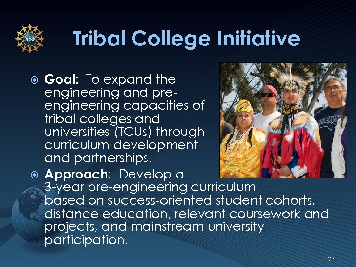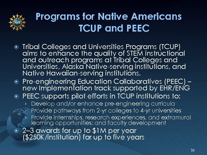 Tribal College Initiative Goal: To expand the engineering and preengineering capacities of tribal colleges and universities (TCUs) through curriculum development and partnerships. Approach: Develop a 3 -year pre-engineering curriculum based on success-oriented student cohorts, distance education, relevant coursework and projects, and mainstream university participation. 23