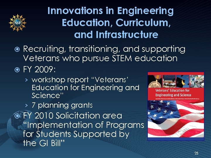Innovations in Engineering Education, Curriculum, and Infrastructure Recruiting, transitioning, and supporting Veterans who pursue STEM education FY 2009: › workshop report “Veterans’ Education for Engineering and Science” › 7 planning grants FY 2010 Solicitation area “Implementation of Programs for Students Supported by the GI Bill” 25