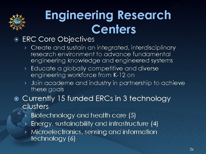 Engineering Research Centers ERC Core Objectives › Create and sustain an integrated, interdisciplinary research environment to advance fundamental engineering knowledge and engineered systems › Educate a globally competitive and diverse engineering workforce from K-12 on › Join academe and industry in partnership to achieve these goals Currently 15 funded ERCs in 3 technology clusters › Biotechnology and health care (5) › Energy, sustainability and infrastructure (4) › Microelectronics, sensing and information technology (6) 26