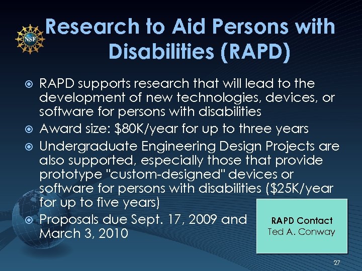Research to Aid Persons with Disabilities (RAPD) RAPD supports research that will lead to the development of new technologies, devices, or software for persons with disabilities Award size: $80 K/year for up to three years Undergraduate Engineering Design Projects are also supported, especially those that provide prototype "custom-designed" devices or software for persons with disabilities ($25 K/year for up to five years) RAPD Contact Proposals due Sept. 17, 2009 and Ted A. Conway March 3, 2010 27