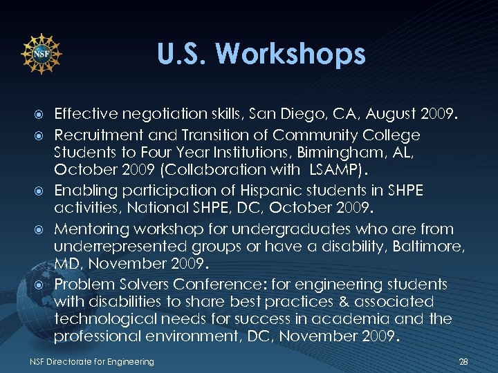 U. S. Workshops Effective negotiation skills, San Diego, CA, August 2009. Recruitment and Transition of Community College Students to Four Year Institutions, Birmingham, AL, October 2009 (Collaboration with LSAMP). Enabling participation of Hispanic students in SHPE activities, National SHPE, DC, October 2009. Mentoring workshop for undergraduates who are from underrepresented groups or have a disability, Baltimore, MD, November 2009. Problem Solvers Conference: for engineering students with disabilities to share best practices & associated technological needs for success in academia and the professional environment, DC, November 2009. NSF Directorate for Engineering 28