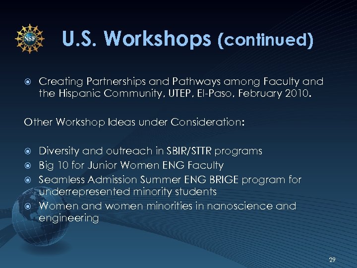 U. S. Workshops (continued) Creating Partnerships and Pathways among Faculty and the Hispanic Community, UTEP, El-Paso, February 2010. Other Workshop Ideas under Consideration: Diversity and outreach in SBIR/STTR programs Big 10 for Junior Women ENG Faculty Seamless Admission Summer ENG BRIGE program for underrepresented minority students Women and women minorities in nanoscience and engineering 29