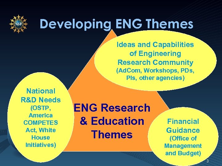 Developing ENG Themes Ideas and Capabilities of Engineering Research Community (Ad. Com, Workshops, PDs, PIs, other agencies) National R&D Needs (OSTP, America COMPETES Act, White House Initiatives) ENG Research & Education Themes Financial Guidance (Office of Management and Budget) 3