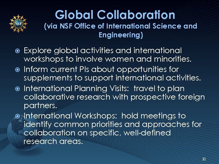 Global Collaboration (via NSF Office of International Science and Engineering) Explore global activities and international workshops to involve women and minorities. Inform current PIs about opportunities for supplements to support international activities. International Planning Visits: travel to plan collaborative research with prospective foreign partners. International Workshops: hold meetings to identify common priorities and approaches for collaboration on specific, well-defined research areas. 30