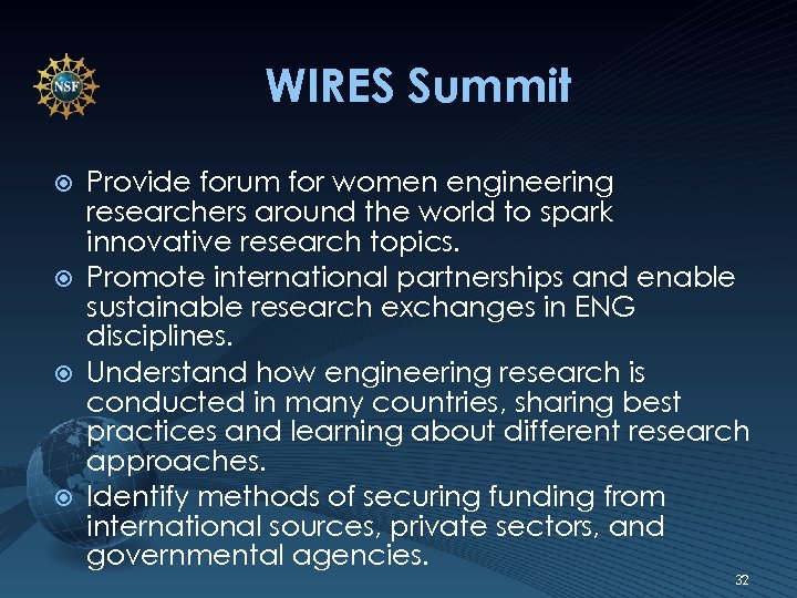 WIRES Summit Provide forum for women engineering researchers around the world to spark innovative research topics. Promote international partnerships and enable sustainable research exchanges in ENG disciplines. Understand how engineering research is conducted in many countries, sharing best practices and learning about different research approaches. Identify methods of securing funding from international sources, private sectors, and governmental agencies. 32