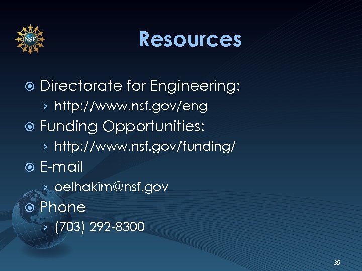 Resources Directorate for Engineering: › http: //www. nsf. gov/eng Funding Opportunities: › http: //www. nsf. gov/funding/ E-mail › oelhakim@nsf. gov Phone › (703) 292 -8300 35