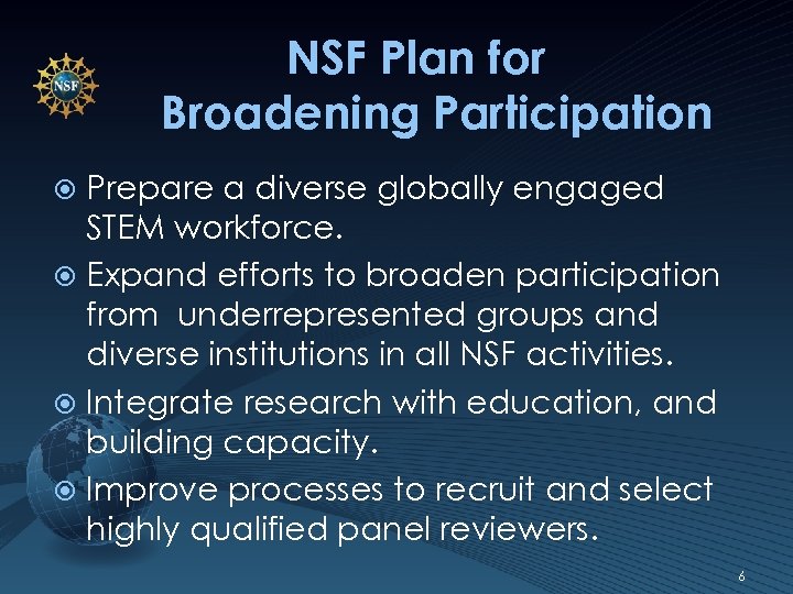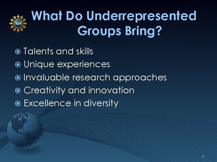 NSF Plan for Broadening Participation Prepare a diverse globally engaged STEM workforce. Expand efforts to broaden participation from underrepresented groups and diverse institutions in all NSF activities. Integrate research with education, and building capacity. Improve processes to recruit and select highly qualified panel reviewers. 6