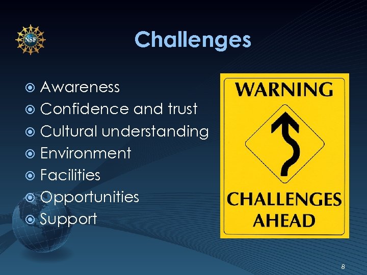 Challenges Awareness Confidence and trust Cultural understanding Environment Facilities Opportunities Support 8