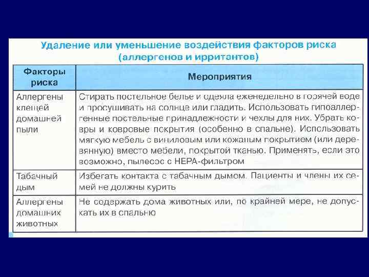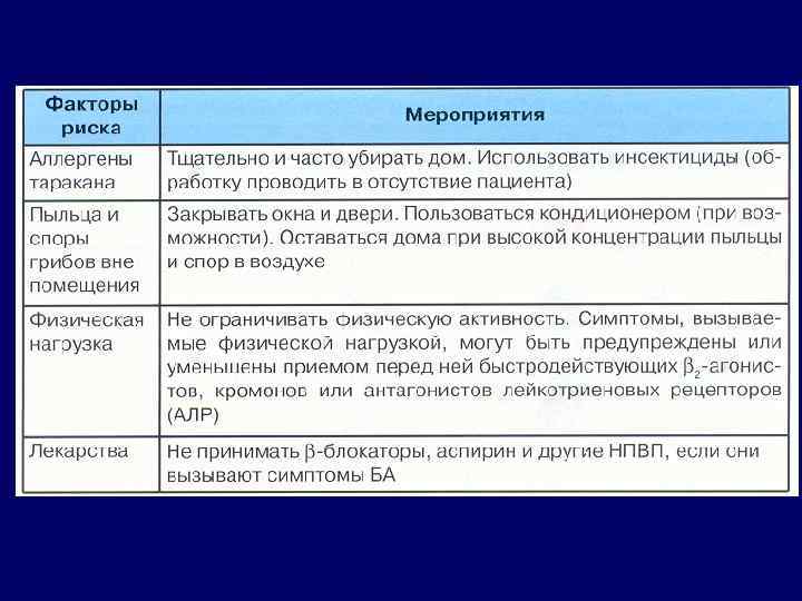Обучение пациентов Пациентам должна быть предоставлена следующая информация: как исключить или уменьшить воздействие факторов риска; как правильно применять лекарства; в чем разница между профилактическими препаратами и средствами скорой помощи; как наблюдать за своим состоянием, учитывая симптомы болезни и (по возможности) ПСВ; как распознать обострение и что при этом делать; почему важно находиться под постоянным медицинским контролем. Совместно с врачом пациент должен подготовить письменный персональный план ведения БА.