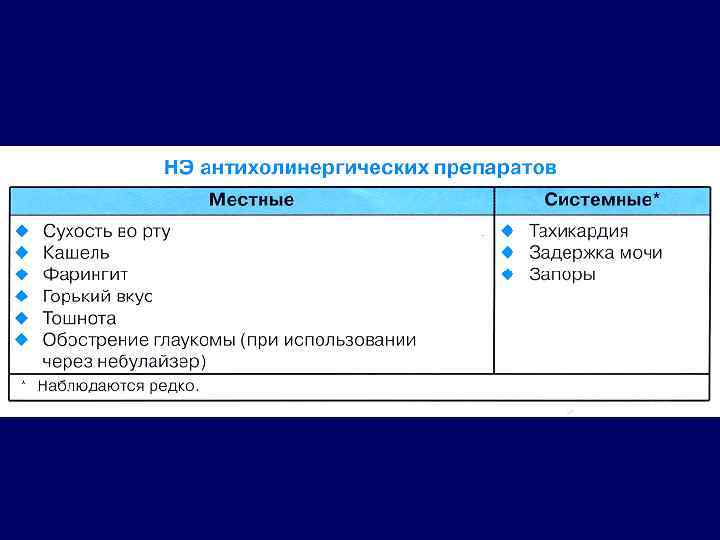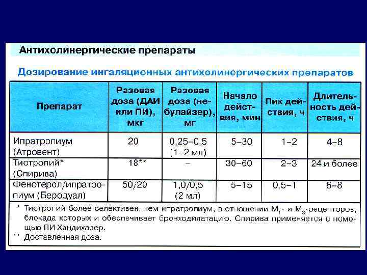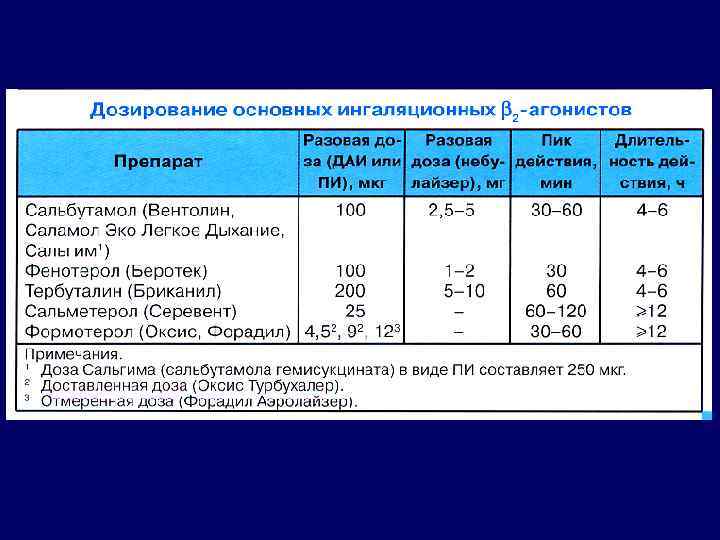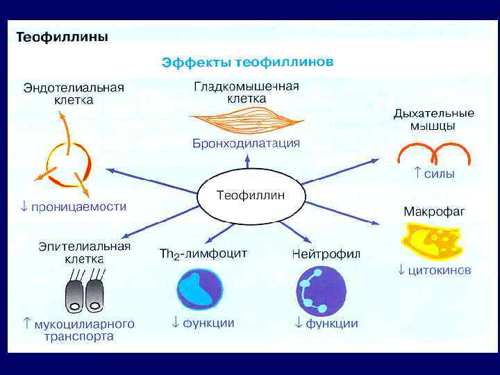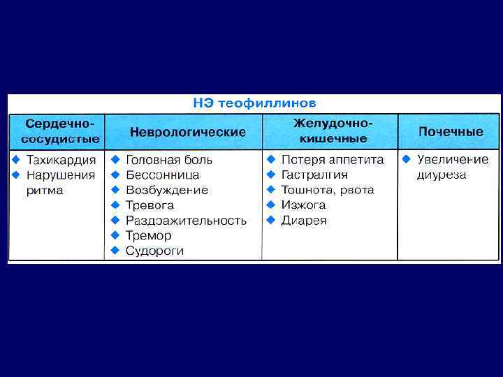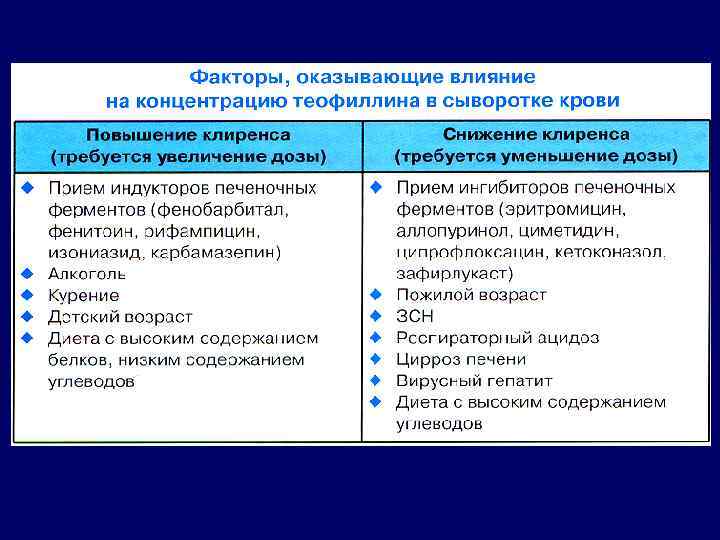 Клинические эффекты теофиллина в зависимости от его концентрации в сыворотке крови (мкг/мл): <5 — нет бронхорасширяющего эффекта; 10 -20 — терапевтический диапазон; 10 -12 — оптимальный диапазон; >20 — тошнота и рвота; >25 — аритмии; >30 — судороги.