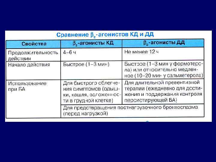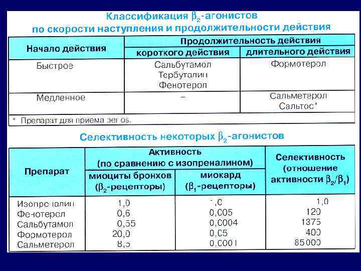 Медикаментозная терапия Основные группы препаратов Все препараты для медикаментозного лечения БА можно разделить на два вида: * препараты, облегчающие симптомы (препараты неотложной помощи): б 2 -агонисты короткого действия (КД), антихолинергические препараты КД, теофиллины КД и системные ГКС (СГКС). Они быстро уменьшают бронхоспазм и симптомы заболевания; * препараты для длительной превентивной терапии (контролирующие течение БА): противовоспалительные препараты (ингаляционные и системные ГКС, кромоны), б 2 -агонисты длительного действия (ДД), АЛР и теофиллины. Учитывая воспалительную природу БА, противовоспалительные препараты рассматриваются как базисная терапия.