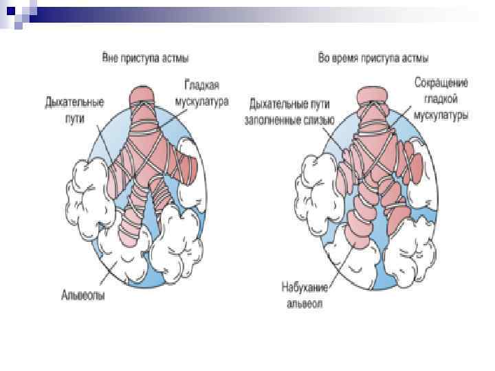 Патогенез n повышенная реактивность бронхиального дерева, обусловленная нарушением регуляции тонуса гладких мышц и действием медиаторов воспаления, что приводит к обратимой обструкции бронхов, которая проявляется повышением сопротивления дыхательных путей, перерастяжением лёгких