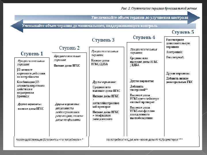 Ступенчатая терапия бронхиальной астмы Основным принципом лечения является ступенчатый подход с увеличением объема терапии при отсутствии контроля и/или наличии факторов риска обострений и снижении объема терапии при достижении и сохранении стабильного контроля и отсутствии факторов риска Каждая ступень включает варианты терапии, которые могут служить альтернативами при выборе поддерживающей терапии бронхиальной астмы Если лечение неэффективно или ответ на него недостаточен, проверьте технику ингаляции, соблюдение назначений, уточните диагноз и оцените сопутствующие заболевания; только после соблюдения этих условий следует повышать объем терапии (переход на ступень вверх).