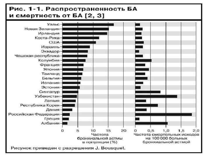 Бронхиальная астма: распространенность в мире ■: >10, 1 ■: 7, 6 -10, 0 ■: 5, 1 -7, 5 ■: 2, 5 -5, 0 ■: 0 -2, 4 M. Masoli, D. Fabian, S. Holt, R. Beasley. Global Burden of Asthma. 2003. 20 с.