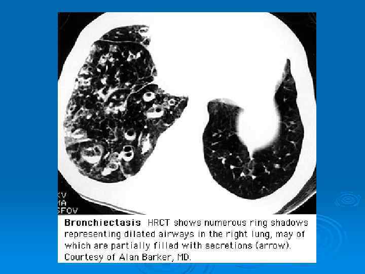 ПАТОГЕНЕЗ Ø Основная причина развития бронхоэктазии в детском и юношеском возрасте — это продуктивное воспаление дистальных воздухопроводящих путей. Деструктивные изменения мышечного и эластического компонентов стенки сопровождаются дилатацией бронхов и функциональными нарушениями. Застой слизи вызывает надсадный кашель с растяжением стенок, разбрызгиванием секрета, закупоркой терминальных бронхиол. Спадение альвеолярной ткани приводит к объемному уменьшению долек, уплотнению перибронховаскулярного интерстиция. Параллельно с вентиляционными нарушениями снижается перфузия легочной паренхимы. Формирование бронхоэктазов часто сочетается с хроническим бронхитом и эмфиземой (ХОБЛ). Среди больных ХОБЛ их выявляют в 18– 27%.