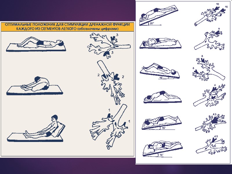 Санация бронхиального дерева Пассивная: постуральный дренаж (не менее 2 раз в сутки); применение отхаркивающих средств и муколитических препаратов; дыхательная гимнастика, вибрационный массаж грудной клетки. Активная: аспирация содержимого бронхов; промывание и последующее введение в бронхи лекарственных веществ; микродренирование трахеи и бронхов (чрескожная микротрахеостома).