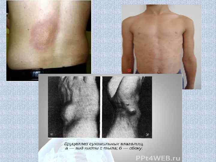 Клиника Инкубационный период длится 7 -21 день (но может продолжаться до нескольких месяцев) В течении бруцеллеза выделяют несколько клин. форм: 1. Острая форма (хар-ся повышением температуры до 38 -39 ° с появлением симптомов интоксикации). 2. Подострая форма ( в результате бактеримии возникает аллергические проявления, начальное поражение органов и систем) 3. Хроническая форма (выраженное поражение о-д аппарата, мышц, мочеполовой и нервной системы) 4. Резидуальная форма (последствия заболевания)