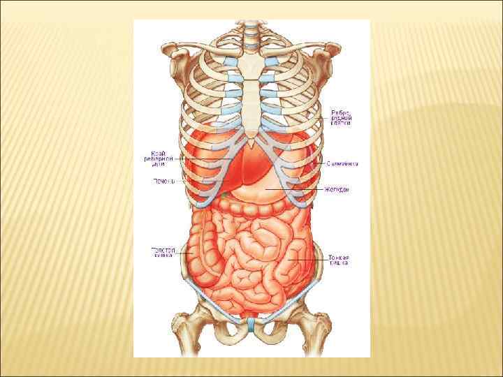 ГРАНИЦЫ ПЕЧЕНИ Печень имеет 2 границы – верхнюю и нижнюю, которые сходятся справа по средней подмышечной линии в 10 межреберье. Сходятся слева – левее грудины на уровне 5 ребра. . Высшая точка верхней границы – по правой среднеключичной линии – 4 ребро Нижняя граница – сначала идёт по реберной дуге (в норме печень не пальпируется), а затем пересекает середину отрезка, соединяющего пупок и мечевидный отросток грудины. Желчный пузырь определяется на пересечении правой реберной дуги и наружного края прямой мышцы живота.