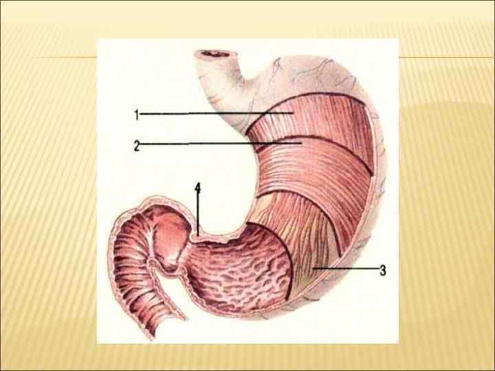 Части 1. 2. 3. 4. желудка: 1. кардиальная или каудальная 2. тело или фундальная 3. привратниковая, или пилорическая, или антральная 4. дно.
